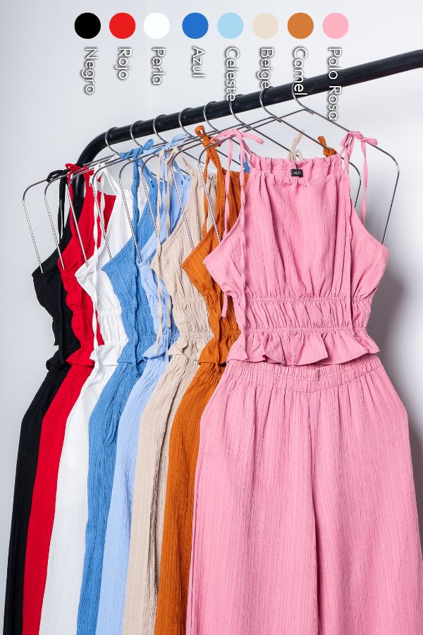 El top es ajustable en la cintura y para sujetar con lazos en los hombros, el palazo es de diseño clásico con bolsillos y basta ancha.