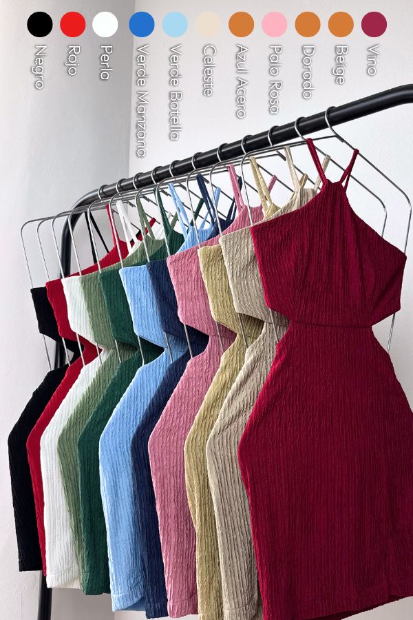 La tela cede un 15% aprox, con elástico y cierre invisible en la espalda.